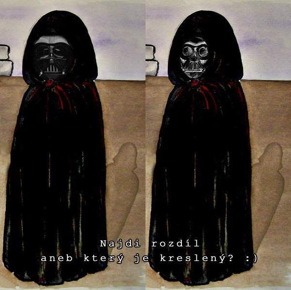 Dobře se tedy bavte a odpusťte mi, prosím, všechny chyby, kterých jsem se při tvorbě dopustila. Omluvte prosím i červené rukavice, které jsem Vaderovi navlékla, a v nichž vypadá ne jako temný lord ze Sith, ale jako uklízečka. Omluvte i jeho podobu (obrázky vznikaly v Itálii, kde jsem neměla žádnou předlohu Vaderovy masky a musela jsem kreslit zpaměti... nicméně, když si tak prohlížím obrázky Vadera a mého Vadera, nebyla jsem moc daleko od skutečnosti, že? :) ). Ale kdyby jste přece jenom náhodou měli nějaké námitky (konec konců, jste SW fani, ne?), mám připravený pádný argument - takhle Vadera pozná jen opravdový fanoušek :)))).